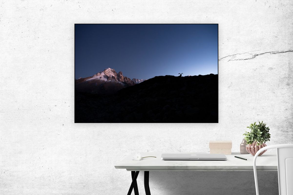 En redescendant du lac Blanc, à Chamonix, une immense ombre se dessina peu avant la nuti. En arrière-plan se profilaient les Grands Drus et un pan du mont Blanc. Le bouquetin, intrigué, nous observait.